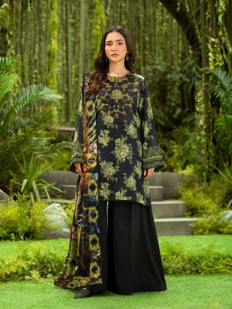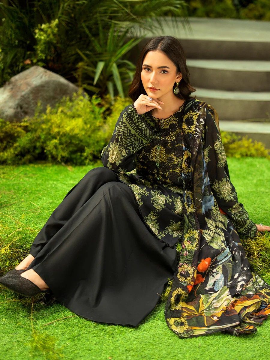 Classic Black Floral Lawn 3PC Unstitched Suit | GLOROUS