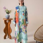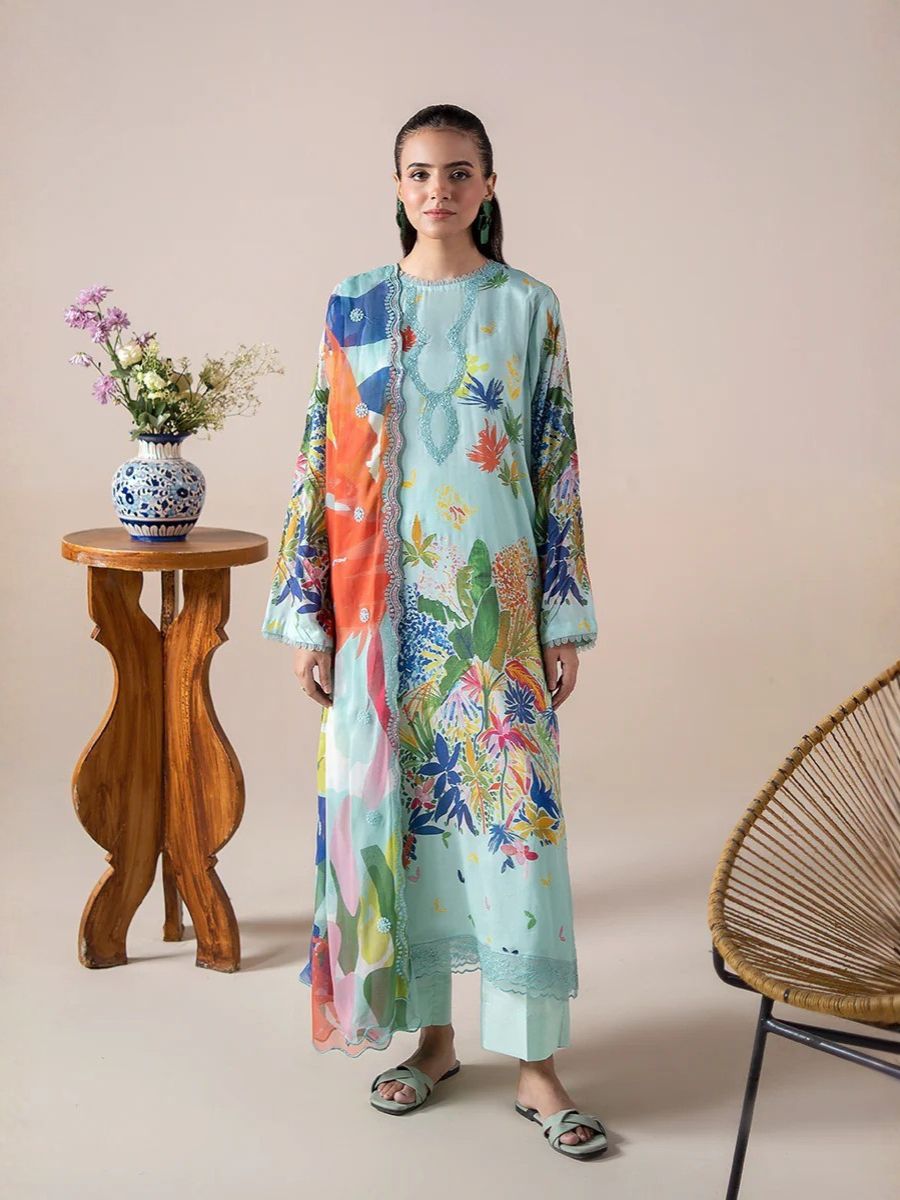 This sophisticated ensemble showcases a beautifully digital-printed lawn shirt, enhanced with delicate organza sequin embroidery on the neckline and front lace—adding a refined festive touch. The look is completed with a graceful digital printed Bamber chiffon dupatta featuring elegant cut-work embroidery, paired with a dyed cambric cotton trouser for all-day comfort.