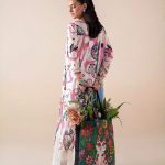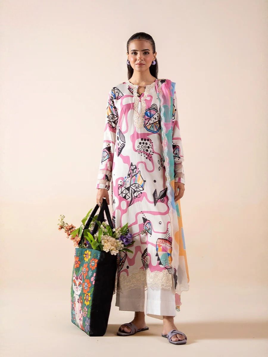 This sophisticated ensemble showcases a beautifully digital-printed lawn shirt, enhanced with delicate organza sequin embroidery on the neckline and front lace—adding a refined festive touch. The look is completed with a graceful digital printed Bamber chiffon dupatta featuring elegant cut-work embroidery, paired with a dyed cambric cotton trouser for all-day comfort.